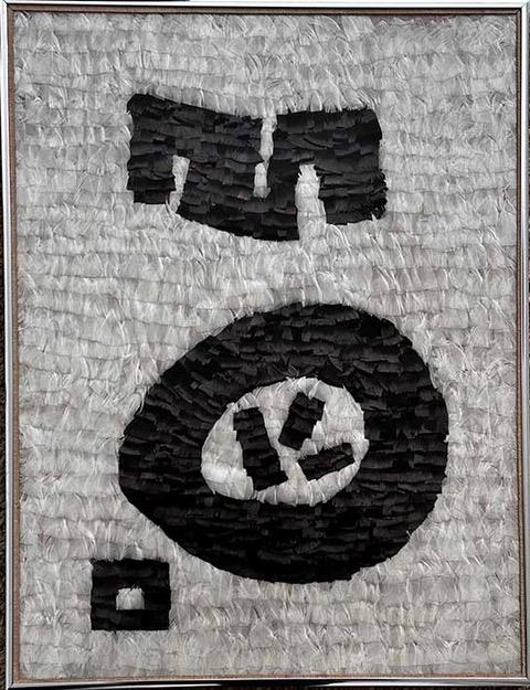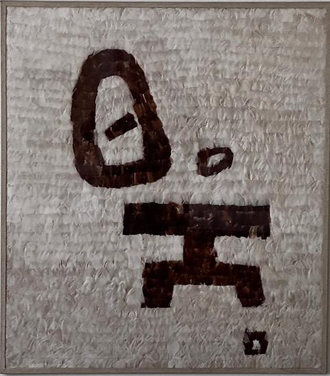 Entwurf: JB, Ausführung: Dorothée Bissier, Bildteppich, 1947, Federn auf Leinen genäht, 77 x 68 cm (SW-Foto, Farben: Braune und weiße Töne)